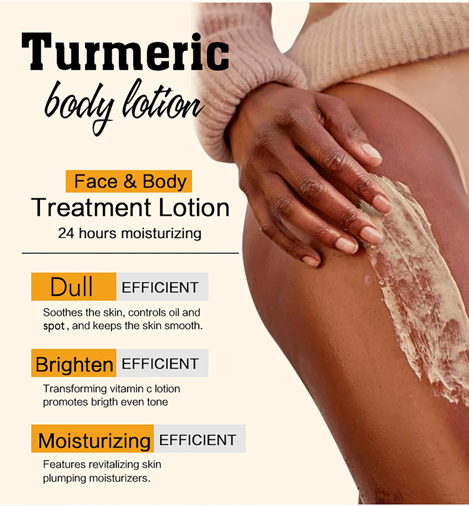 Harness the power of turmeric with our Anti-Aging Firming & Brightening Lotion. This nourishing formula helps reduce fine lines, firm the skin, and enhance radiance while providing deep hydration. Lightweight and natural, it promotes a smoother, brighter, and more youthful-looking complexion every day.